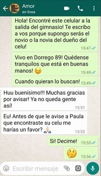 "Hola! Encontré este celular a la salida del gimnasio! Te escribo a vos porque supongo serás el novio o la novia del dueño del celu! Quédense tranquilos que está en buenas manos", escribió la persona que encontró el celular a quien la chica tenía agendado como "Amor".