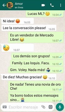 "Leé la conversación please!", le ordenó nervioso y ansioso cuando le comentaron que su novia se escribía con un tal "Lucas ML", hasta que descubrió el detalle de la conversación y se quedó más tranquilo: era un usuario del sitio Mercado Libre con el que iba a coordinar la venta un producto.
