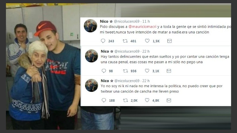 Nicolás Lucero, el joven de 20 años detenido por un tuit contra el presidente Mauricio Macri de hace un años, dijo estar “arrepentido”, aseguró que nunca pensó “en matar a nadie, mucho menos a alguien tan importante” y que aludió a una canción de cancha cuando escribió en la red social: “Macri te vamos a matar, no te va a salvar ni la federal (la 12)”.