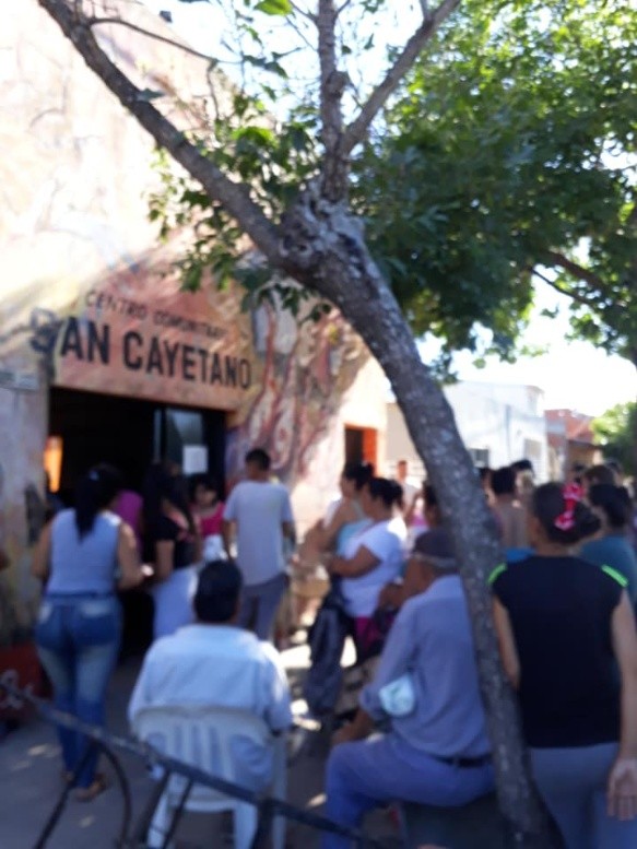Unas 10 mujeres voluntarias sacan adelante día a día el comedor “San Cayetano”. Algunas de ellas trabajan en el Banco de Alimentos a cambio de mercadería para este centro comunitario. “Cada día entre todas estas grandes mujeres que ven trabajando a la par, golpeamos puertas para que esto siga delante, para que cada familia tenga su alimento”, expresó Claudia, una de las encargadas.
