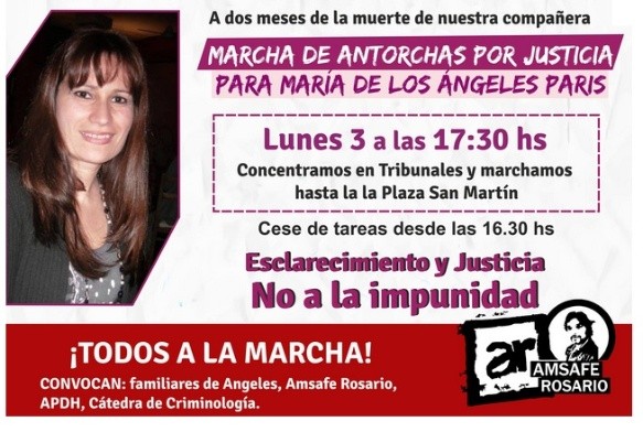 “A dos meses de la muerte de nuestra compañera, este lunes a las 17.30 renovamos nuestro compromiso por el esclarecimiento y justicia y concentramos en Tribunales (Pellegrini y Balcarce) para marchar nuevamente hasta plaza San Martín (Santa Fe y Dorrego) por justicia para María de los Ángeles París”, señalaron desde la delegación local del gremio docente.