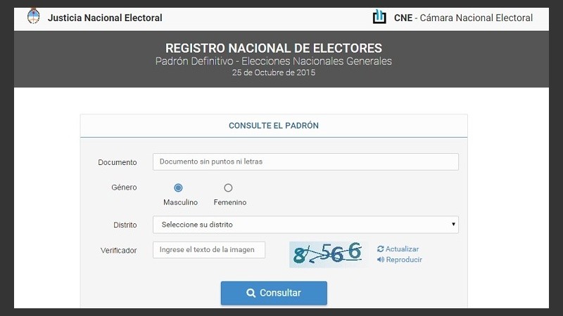 La Cámara Nacional Electoral record. que al padrón también se puede acceder a través de la página web www.electoral.gov.ar, por teléfono al 0800-999-7237 o personalmente en la Secretaría Electoral de cada distrito.