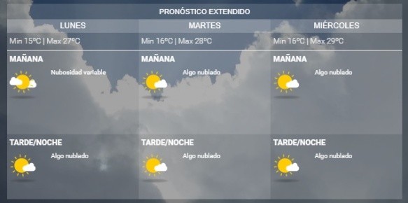 Para lo que resta de la jornada el Servicio Meteorológico Nacional (SMN) anuncia cielo parcial a algo nublado, vientos moderados a leves del sector este, con máxima de 26 grados.