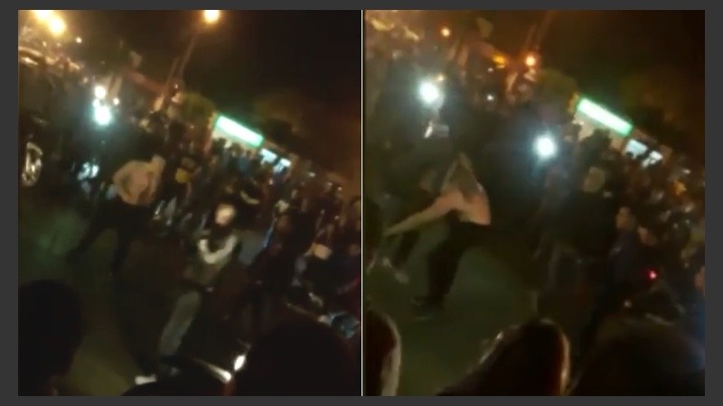 El choque en modo “vale todo” entre una persona con el torso desnudo y otra vestida es presenciada por una multitud. Son decenas de personas paradas sobre el bulevar que rodean lo que ocurre y que habrían acudido a una cita especial, según informó el Tres.