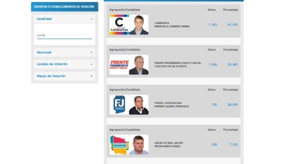 El joven se impuso en la votación al conseguir 1.483 votos (41,63%), superando al candidato del Frente Progresista, Oscar Cagliero (1.036 votos), al del Frente Justicialista, Albino Moreno (742 votos), y al de Unión Vecinal Sastre, Mario Broda (258 votos).