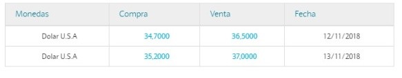 Pasadas las 13, la cotización en el Banco Nación era de 35,20 y 37,00 para las puntas vendedores y compradoras. Medio peso por encima del cierre del lunes.