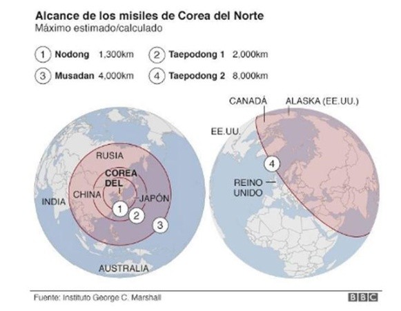 Según los cálculos del Instituto George C. Marshall, algunos de esos misiles podrían alcanzar los 8 mil kilómetros de distancia. Es decir que podrían llegar a parte de los Estados Unidos y Canadá.