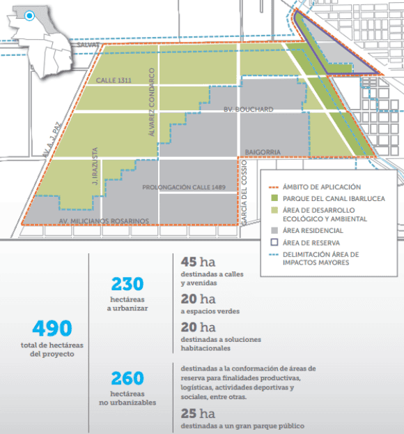 La clave, destacó la intendenta junto a los secretarios Gustavo Leone y Pablo Javkin, es que los privados que poseen tierras en el lugar -hay 120 lotes aunque muchos pertenecen a un mismo grupo- deberán ceder 20 hectáreas sobre la calle Bouchard, que será el "nuevo eje" del futuro barrio.