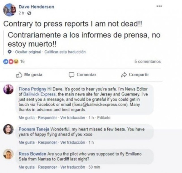De hecho, el propio Henderson, a quien se creía al principio al mando del monomotor de seis plazas desaparecido, publicó en su cuenta de Facebook que él estaba vivo, contradiciendo noticias sobre su muerte, y luego cerró su perfil.