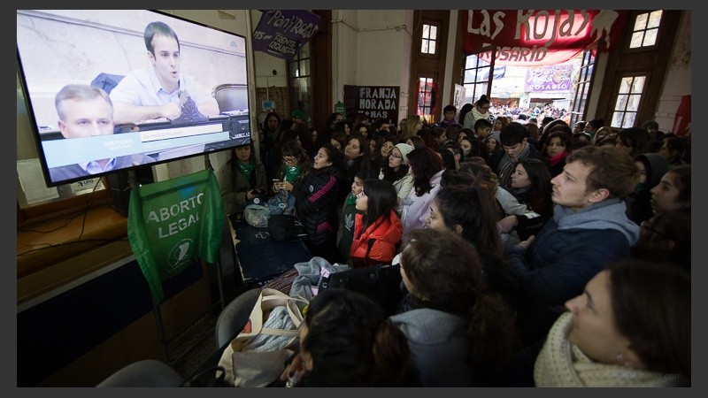 Allí se concentraban miles de estudiantes pero también miembros de organizaciones sociales y sindicales, además de público en general, para asistir en vivo la proyección desde la cámara de Diputados en pantalla gigante.
