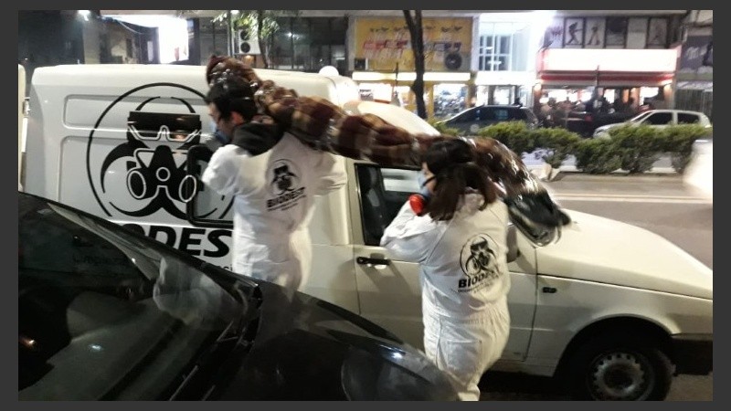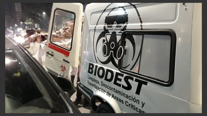Efectivamente dos personas cargaban una alfombra y la introducían en un utilitario que tenía estampado en sus laterales la firma "Biodest", que se anunciaba como una empresa de "limpieza, descontaminación y esterilización de áreas críticas".