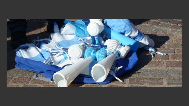 A las banderas celestes y blancas, se suman los gorros de tres puntas en el mismo tono y hasta vuvuzelas y cornetas que seguro quedaron como remanente del último Mundial de Fútbol.