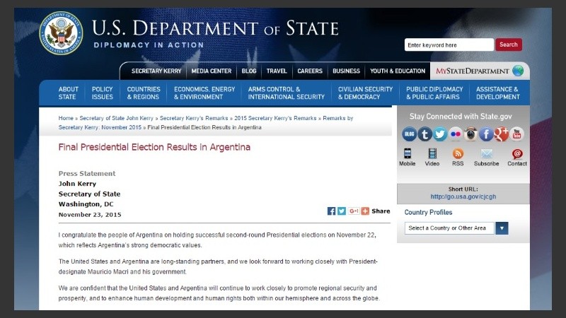 “Estados Unidos y Argentina son socios desde hace mucho tiempo, y trabajaremos estrechamente con el presidente electo Mauricio Macri y su gobierno”, afirmó el titular de Exteriores estadounidense.