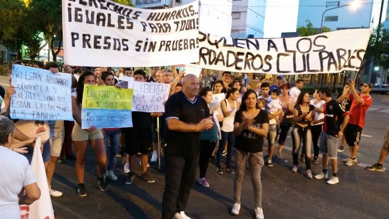 Familiares y amigos de los cinco imputados por la desaparición y muerte de Gerardo Escobar participaron este lunes de una marcha en la zona de Tribunales para pedir la libertad de los acusados.