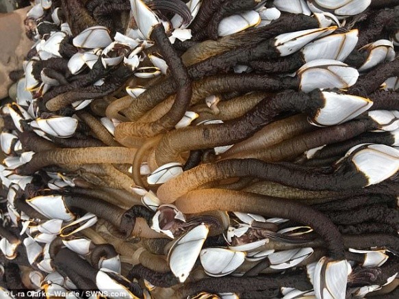 Al ver uno de esos animales, la mujer pensó que se trataba de las entrañas de alguna criatura muerta. Sin embargo, rápidamente halló un montón de estos especímenes aferrándose a un tronco, que resultaron ser crustáceos filtradores conocidos como percebes.