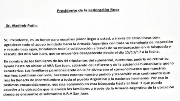 Familiares de los 44 tripulantes del ARA San Juan firmaron una carta para pedir al presidente de la Federación Rusa, Vladímir Putin, que mantenga la ayuda en la búsqueda del submarino desaparecido en el Mar Argentino.