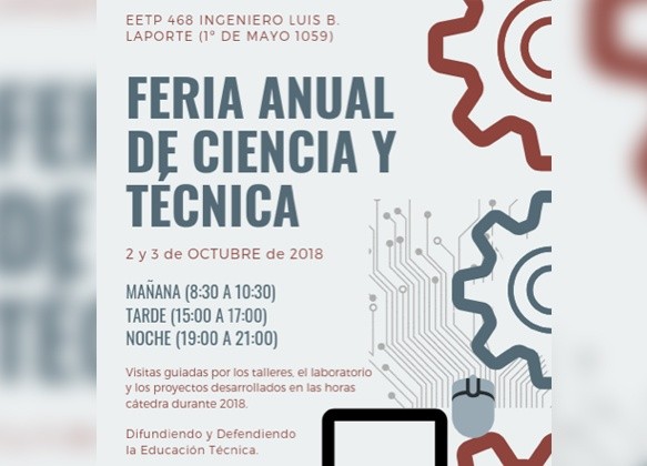 La Escuela de Educación Técnico Profesional Nº 468 (ex técnica 6) invita a recorrer su feria anual de ciencia y técnica este martes y miércoles para interiorizarse en el trabajo que los alumnos realizaron en dicha institución. La iniciativa cuenta con muestras de talleres, laboratorios y proyectos educativos.