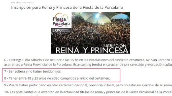 Sin embargo, los requisitos para participar del concurso no parecen ser tan amplios como dijo el dirigente. El punto 7 establece que la concursante debe “ser soltera y no haber tenido hijos” y el ítem 8: “Tener entre 18 y 25 años de edad cumplidos al inicio del certamen”.