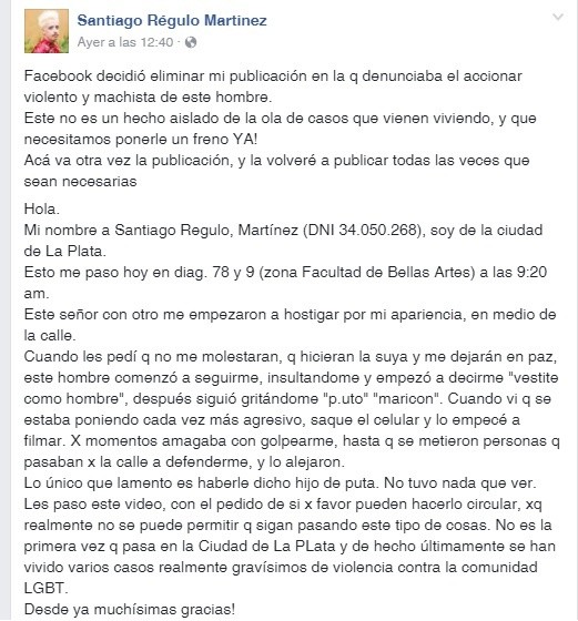 El posteo Santiago lo cierra con la frase: "No es la primera vez q pasa en la Ciudad de La Plata y de hecho últimamente se han vivido varios casos realmente gravísimos de violencia contra la comunidad LGBT".