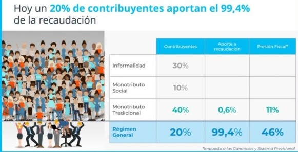 Para retratar que "hoy un 20 por ciento aporta el 99,4 por ciento de la recaudación", eligieron una imagen en la que siete personas rubias, de piel clara y con traje, sostienen a otro grupo más numeroso, cuya piel y cabello es más oscuro.