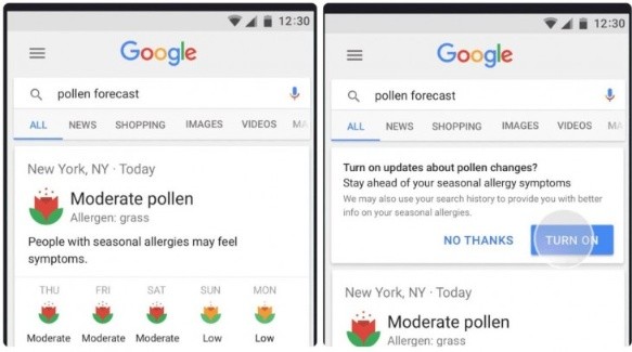 Gracias a un acuerdo con The Weather Channel, Google anadió en su página información sobre los niveles de polen y creó un sistema que envía alertas a modo de previsión a los celulares de aquellos usuarios con alergias estacionales que quieran estar prevenidos ante cualquier eventualidad, según Télam.