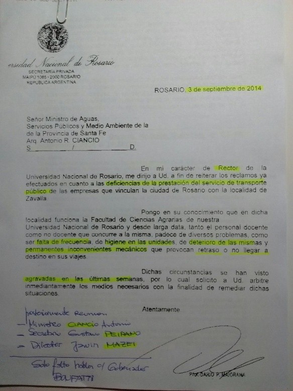 "Tengo una nota firmada por Javier Mazzei, ex director de Transporte de la provincia. Le planteábamos que se rompían los colectivos,que los alumnos y profesores, por ese motivo, nunca podían llegar a horario", recordó el decano.