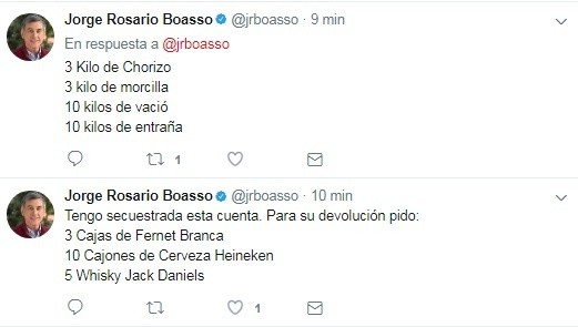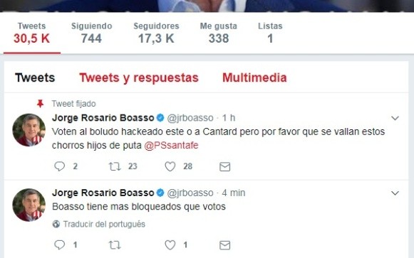 Llamó la atención lo prolongado del ataque. En más de tres horas, el hacker ridiculizó a Boasso, insultó al socialismo y al kirchnerismo pero llamó a votar "al boludo hackeado este o a Cantard" (el primer candidato de la lista de Cambiemos en Santa Fe). Ese mensaje, incluso, lo retuiteó y lo fijó como principal.