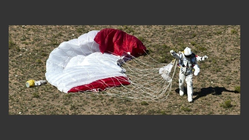 En total ha requerido unos 16 minutos en tocar suelo en un aterrizaje perfecto en paracaídas tras lanzarse al vacío dentro de su traje presurizado, que le protegió de la baja presión y las bajas temperaturas.