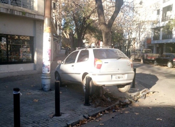 En las primeras horas de este sábado, los que pasaban por San Lorenzo y Rodríguez, en el macrocentro rosarino, se asombraban al ver un auto montado al petril de la vereda, a pocos centímetros de meterse en un local comercial de la esquina. El conductor había abandonado el vehículo, un Fiat Palio, posiblemente en busca de ayuda para sacarlo de ahí.