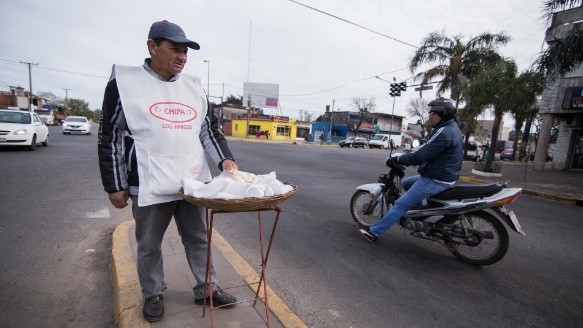 Se quedará ahí parado hasta el mediodía, se irá a su casa para volver a las 15 y mantenerse hasta que caiga el sol. Ocho horas, cada día de lunes a viernes, hace equilibrio en su oficina a cielo abierto: el cantero de medio metro de ancho sobre 27. Tiene la presión de vender 50 bolsas de chipá por jornada a 20 pesos las cuatro unidades (diez pesos son para él). No siempre lo logra. Pero Antoliano no cree tener una tarea dura. Está muy lejos de la exigencia del campo en su Paraguay natal. Desde los 8 años le tocó salir a la chacra que tenía su padre en Encarnación. Madrugaba antes del amanecer y le daba con la azada a la maleza.