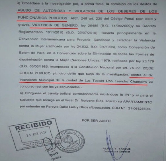 El intendente de la localidad de Las Toscas, Leandro Chamorro, fue denunciado por violencia de género por la defensora general del viejo sistema procesal penal de la provincia, Alicia Yaique. La funcionaria presentó un escrito ante el Ministerio Público de la Acusación (MPA) en el que solicitó que se inicie la instrucción penal preparatoria.