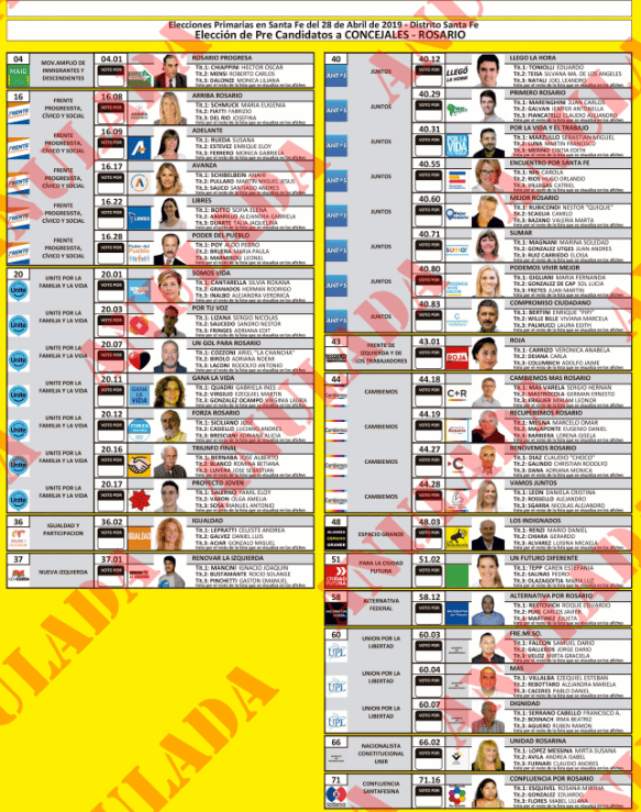 Hay competencia interna en casi todos los frentes. Por caso, en el Frente Progresista hay disputa entre cinco listas (las encabezan María Eugenia Schmuck, Susana Rueda, Analía Schibelbein, Sofía Botto y Aldo Pedro Poy), en el justicialismo entre ocho (Eduardo Toniolli, Fernanda Gigliani, Carola Nin, Juan Marenghini, Enrique Bertini, Marina Magnani, Néstor Quique Rubicondi, y Sebastián Marzullo), mientras que en Cambiemos son cuatro (Sergio Más Varela, Marcelo Megna, Claudio Díaz y Daniela León).