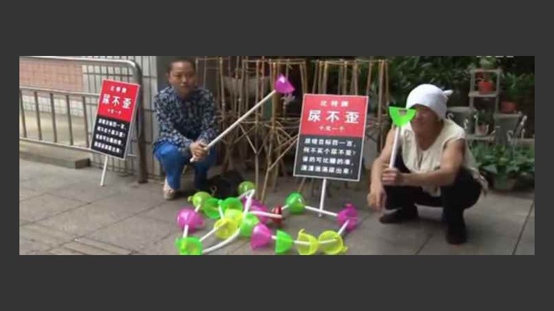 El invento chino está compuesto por un embudo y una manguera, así de sencillo y eficiente, y se vende afuera de cualquier baño público.