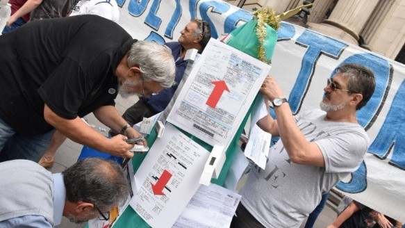 Al brindis con agua y pan para fin de año de los jubilados en el centro, como una forma de manifestar sus haberes de hambre, se sumó este 2017 el arbolito navideño que en lugar de bolas y guirnaldas ostentó facturas de servicios de luz, gas y agua.