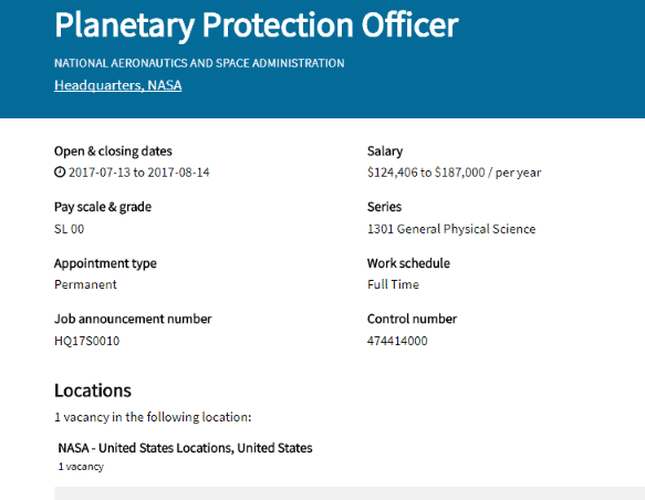 El puesto de trabajo es de tiempo completo y el cargo es de "oficial de protección planetaria" con un salario anual de entre 124 mil y 187 mil dólares. El seleccionado para ocupar el cargo será el encargado de la implementación de las políticas para la protección del planeta en las misiones espaciales de la Nasa.