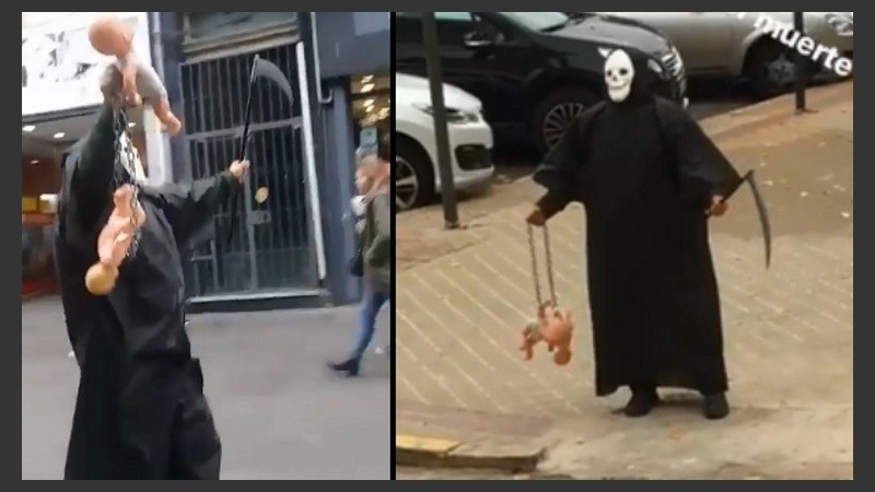 La persona caminó por las calles vestida como “la muerte”, personificada con un atuendo negro, una careta y una guadaña. Al disfraz le sumó dos bebés colgando de una cadena.