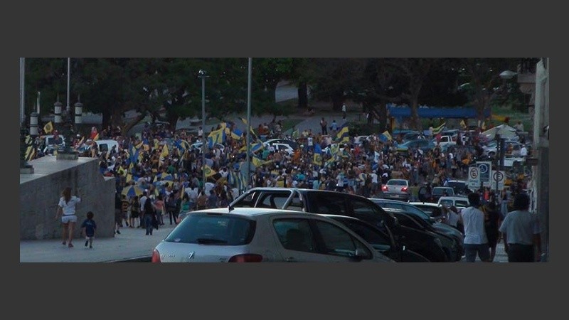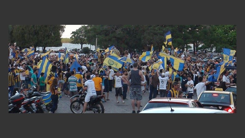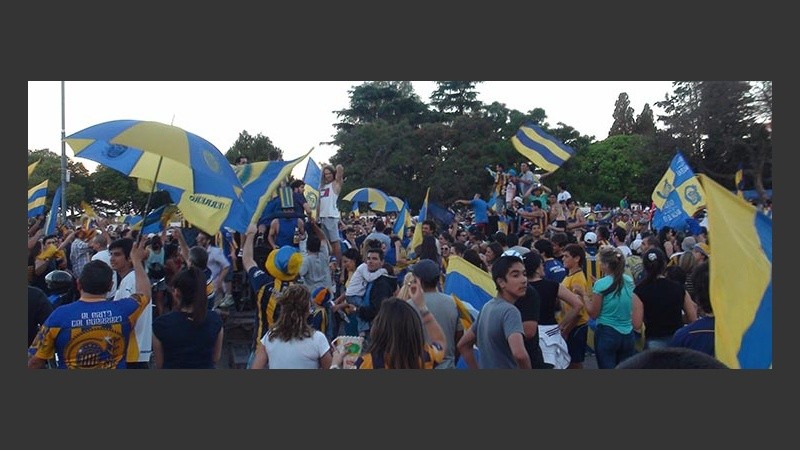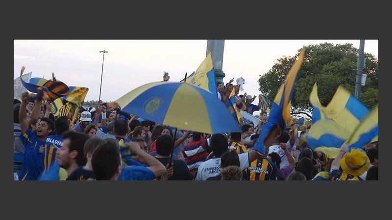 Con el correr de los minutos, se fueron sumando otros que llegaban desde el estadio de Arroyito, y desde otros puntos de la ciudad. Banderas, bocinas y canciones para festejar y cargar al histórico rival.