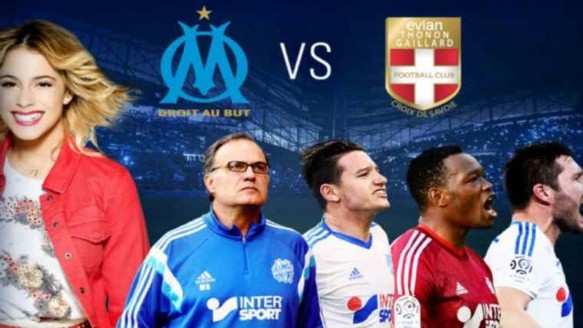 La imagen, que anuncia el encuentro que disputarán el Olympique y el Evian por la Liga Francesa este sábado, tiene al mismísimo Marcelo, los jugadores y, casi por un costado, a una Tini sonriente.