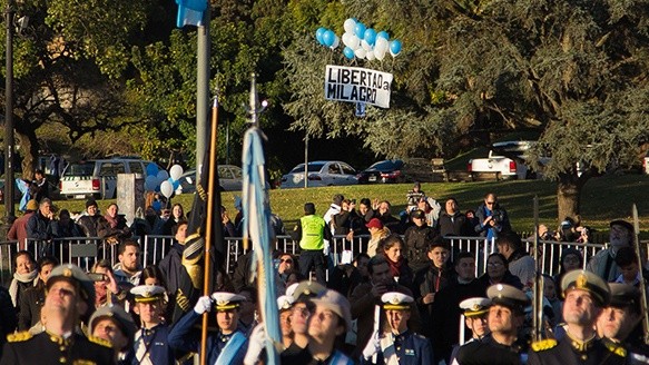 Con todo, el “sí se puede” se escuchó otra vez. Macri lo dijo casi como al pasar al hablar sobre la figura “inspiradora” de Manuel Belgrano. Nadie lo secundó ni se convirtió en cántico, pero desde lejos lo festejaron y lo abuchearon, en sonido que llegaba esquizofrénico. Los simpatizantes y los no tanto estaban detrás de otra valla, sobre calle Rioja. No eran muchos. Ni de uno ni de otro lado. Se distinguían además porque unos hacían flamear banderas argentinas y otros, carteles con consignas por la libertad de Milagro Sala, la líder de la Tupac Amaru detenida en Jujuy. Al final del izamiento, incluso, habían arrojado al cielo el pedido entre globos celestes y blancos.
