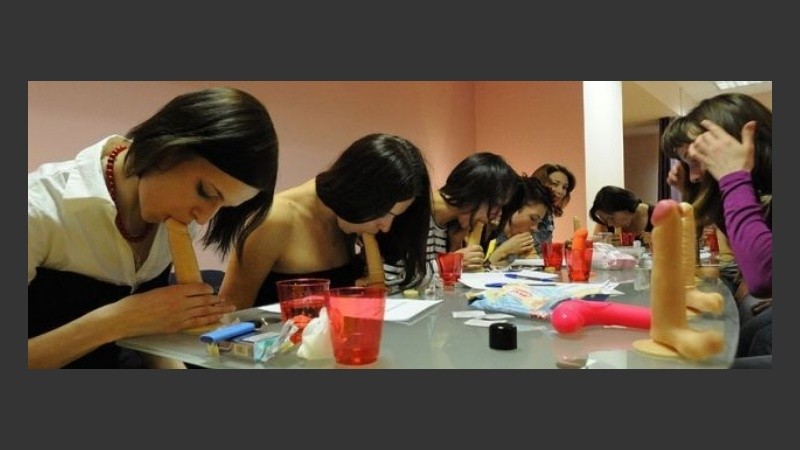 El entrenamiento tiene unas tres horas y media de duración y, según las fotos que trascendieron, resulta curioso ver a las mujeres con consoladores, profilácticos y en pose imitando formas para brindar placer.