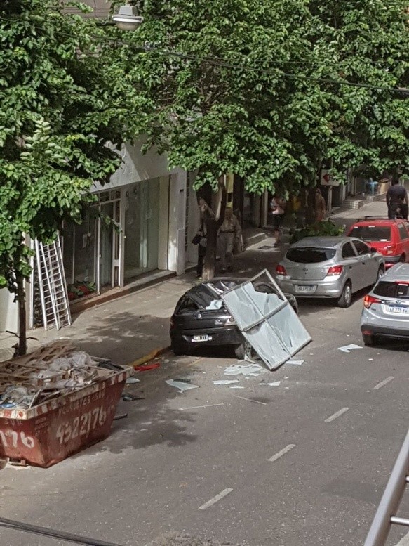 Una de las imágenes más impactantes es la de un auto que quedó destruido en tras ser impactado por una chapa que se desprendió de edificio de Córdoba y Rodríguez como consecuencia del viento: