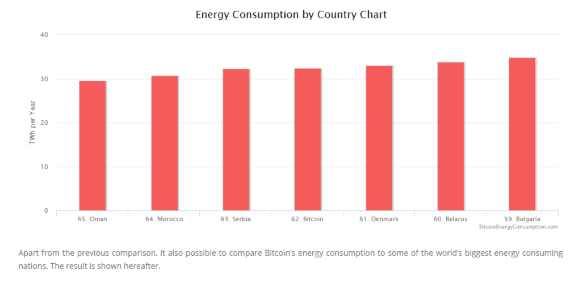 El analista de criptomonedas Alex de Vries, a cargo del sitio Digiconomist, creó un índice por el que estima que este año minar insumirá 31.960 GWh de energía eléctrica a nivel mundial. Si el Bitcoin fuera un país ocuparía el ranking 62 en consumo anual de electricidad, por delante de Serbia (7 millones de habitantes). En promedio hay 150 países con menor gasto de electricidad anual que el Bitcoin.