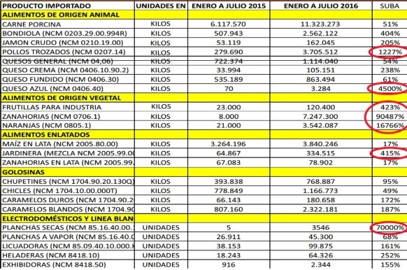 El ingreso de productos al país que generan un impacto en la economía de Santa Fe continúa en alza y el tercer informe del Observatorio de Importaciones presentado este viernes detectó casos llamativos, sobre todo en alimentos. Entre enero y julio de este año, comparado con el mismo período de 2015, se incrementó 1227% la cantidad en kilos de pollos trozados, 4500% los de queso azul y 90.000% las zanahorias.
