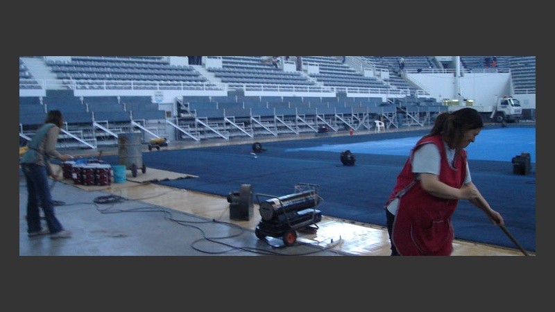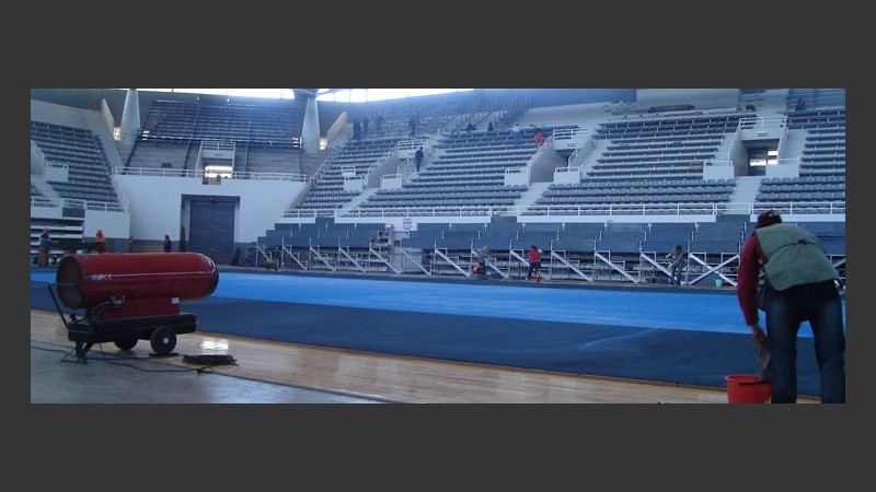 En otro sector, en tanto, se trabajaba en la colocación del aire acondicionado, mientras que también se trabajaba en el armado de platea para llevar a doce mil personas la capacidad del estadio. También había tareas de reacondicionamiento de los sectores de vestuarios. En el exterior del polideportivo hay reparación de veredas, puesta a punto de las luminarias, trabajos de pintura y parquización.