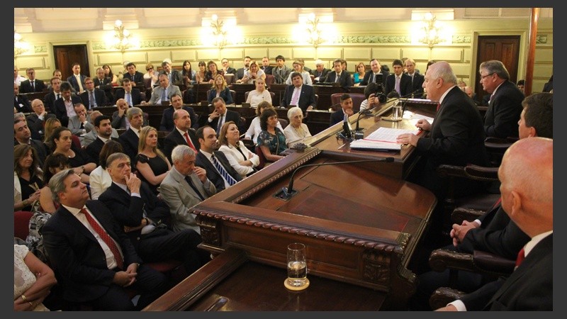 A diferencia del cansancio en el rostro que no pudo esconder al final de la campaña de las elecciones generales, esta vez Miguel Lifschitz apareció radiante. Su vice gobernador, Carlos Fascendini, le tomó el juramento "por la patria y el honor". Después, se cantó el Himno Nacional Argentino y cuando el reloj marcó las 10.28, dio comienzo a su discurso que se extendió casi por una hora.