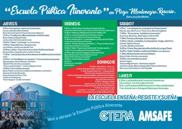 La escuela pública Itinerante, creada por los sindicatos docentes para reclamar el llamado a paritarias nacionales del sector, llega esta semana a la provincia y desde el jueves se instalará en Rosario con diferentes actividades.