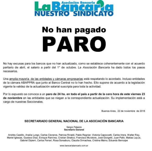 Según un comunicado de La Bancaria, “no hay excusas para los bancos que no han actualizado el salario a partir del 1º de octubre”, tal cual establece el convenio firmado en abril pasado. Desde ese mes, el haber debía aumentar un 12 por ciento para llegar al 40 por ciento y equiparar la inflación.