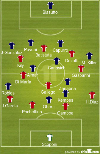 Lotuf armó un 4-2-1-3, con Zanabria moviéndose libre delante de Aimar y Carlovich. Seisas en cambio, se inclinó por un 4-1-2-3, con Gallego bien plantado en el círculo central y con obligaciones de ida y vuelta para Gasparini y Di María.