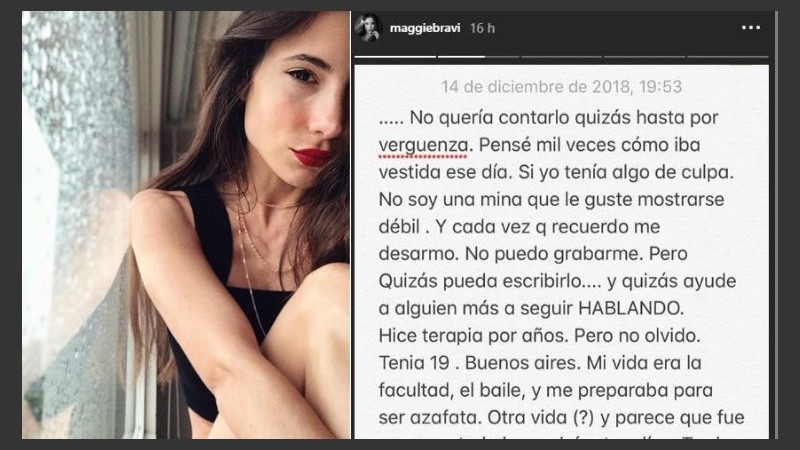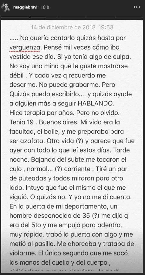 En el marco de las denuncias por violación, abuso o acoso sexual que desató el caso Thelma Fardín contra Juan Darthés y nucleado en #Miracomonosponemos y #Nonoscallamosmas, la bailarina y conductora de televisión Magui Bravi sumó su testimonio.