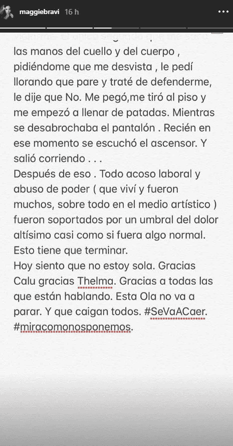"Después de eso, todo acoso laboral y abuso de poder que viví, y fueron muchos, dentro del ambiente artístico fueron soportados por un umbral de dolor altísimo, casi como si fuera algo normal. Esto tiene que terminar. Hoy siento que no estoy sola. Gracias Calu, gracias Thelma. Gracias a todas las que están hablando. Esta ola no va a parar. Y que caigan todos. Se va a car. Mirá cómo nos ponemos", completó.